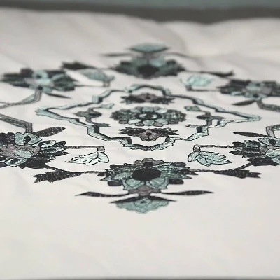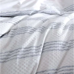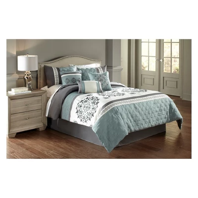 Update and refresh your bedroom with the Alex 7 Piece Comforter Set. The beautiful embroidery and soothing colors of spa, gray and white are sure to create a relaxing getway in your own home. This set includes one comforter, one bedskirt (with an 18 inch drop), two standard shams and three decorative pillows. This bedding set is machine washable for easy care and maintenance. 100% polyester.