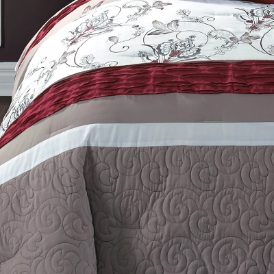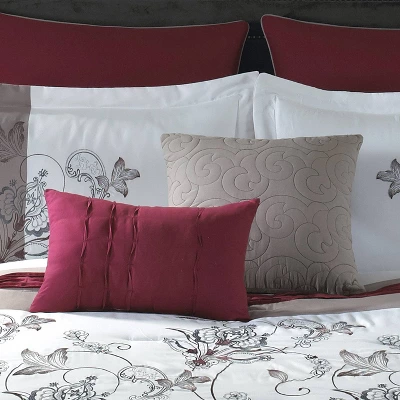 The 8 Piece Ellie multi piece comforter set is all you need to transform your bedroom. The set features an intricate embroidered floral pattern that is complimented by the white, taupe and red color scheme. This bedding set includes one comforter, one bedskirt (with an 18 inch drop), two standard shams, two euro shams and two coordinating decorative pillows. This set is machine washable for easy care and maintenance.