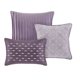 Update your bedroom decor with the sophisticated Cullen Comforter Set. This bedding set features a simple but chic design with textured wrinkle stripes. Includes a plush comforter, 2 coordinating pillow shams, 3 decorative pillows and a bed skirt to create a professional, layered look in an instant. Available in Queen, King or California King sizes. Fits mattresses up to 15″. Available in gray, plum or white.