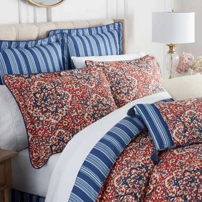 Bring Assiduous Contemporary design to your bedroom and transform your space with the Waverly Tabriz Striped Euro Pillow. Features a blue striped design on 180 Thread Count 100% Cotton Percale with blue cording along the knife edges. Coordinates and perfectly complements the Waverly Tabriz 4-Piece Comforter Set. Machine washable for easy care and cleaning.