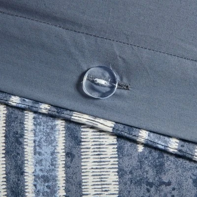 Revive your bedroom with the sophisticated style of the Cotton Printed Duvet Cover with Trims. Made from 100% cotton, this duvet cover features an overscaled global ikat print with braided cotton trims that add dimension and texture. The 2 matching shams repeat the pattern of the duvet cover to complete the cotton bedding set. Machine washable for easy care, this cotton printed duvet cover set brings a handsome look and soft comfort to elevate your bedroom decor. A button closure at the foot end allows you to place a padded insert within the duvet cover and inside corner ties prevent it from shifting (insert is NOT included).
