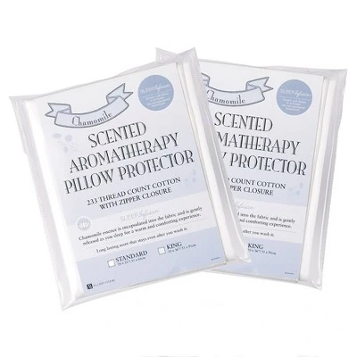 Refresh your pillow with this specially crafted pillow protector designed for comfort and relaxing sleep experience. The Dream Infusion Chamomile Pillow Protector by Allied Home features 233 thread count cotton infused with herbal scent of chamomile through a patented encapsulated technology. The calming scent of chamomile is gently released as you naturally move while sleeping. Constructed with a zipper closure and detailed with satin edge cord.