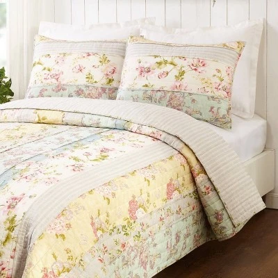 Add a romantic English garden ambience to your bedroom with this new quilt design from Jessica Simpson. The pretty, pieced shams are a mix of lovely, vintage, wallpaper floral prints. The design has horizontal piecing and frayed edges where each print meets that create an added tactile accent. The distressed florals in pastel shades are mixed with a textured ticking stripe in an unexpected combination of white stripes on a textured gray ground. This fresh spin on a timeless look is the perfect way to create your beautiful bedroom.