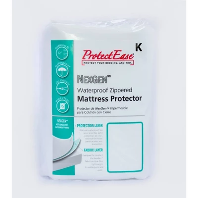The ProtectEase® NEXGEN zippered mattress cover is made from a new waterproof fabric that protects against stains and spills, allergens and bed bugs. The zippered, waterproof mattress protector is constructed from a new NexGen™ fabric. This Next Generation fabric is designed to replace the older plastic vinyl covers that often smelled of chemicals. This cover will protect your mattress from stains and spills and your family from dust mites and allergens. Zippered closure to fully encase your mattress.