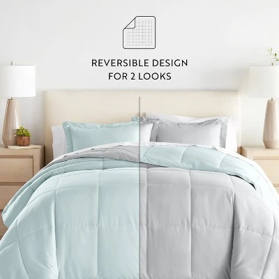 Give your bedding a brand new look and feel with this all season reversible down alternative comforter set. Presenting a quality alternative to down, it’s incredible loft and down like feel makes it the perfect comforter to keep you cozy all year round. The end to end baffle box construction with reinforced stitching helps to eliminate the need for regular fluffing by preventing the fibers from shifting. Featuring a reversible design of aesthetically matched colors, this set is ideal for making quick style changes to your sleep space! The set includes 3 pieces(1 Comforter and 2 Shams), and the Twin/TwinXL set comes as a 2 piece set (1 Comforter and 1 Sham).