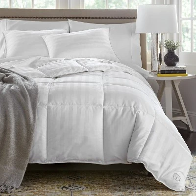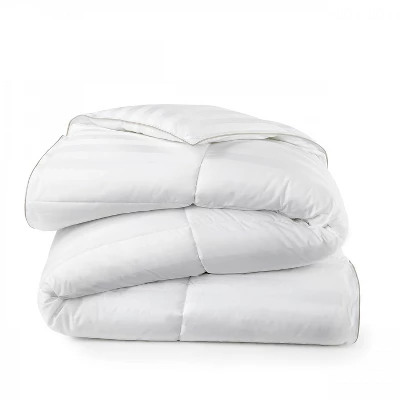 Wrap yourself in the indulgent comfort of Stearns & Foster®. The ideal weight for any season, this comforter has PrimaCool™ fabric, an innovative blend of Tencel® and cotton that helps to keep you cool all night. Experience the premium design of 400 thread count cotton and sewn-thru construction, used specifically to ensure that the fill stays in place and leaves you with even coverage throughout the comforter. The silky fabric is treated with both an antimicrobial finish as well as Scotchguard™ stain release for easier care. Please note the new model does not have a taupe or gold color trim – it is simply white. This model DOES NOT contain corner duvet tabsSize & Weights:Queen – 90″ x 98″, 68 oz. FillKing – 108″ x 98′, 82 oz. Fill